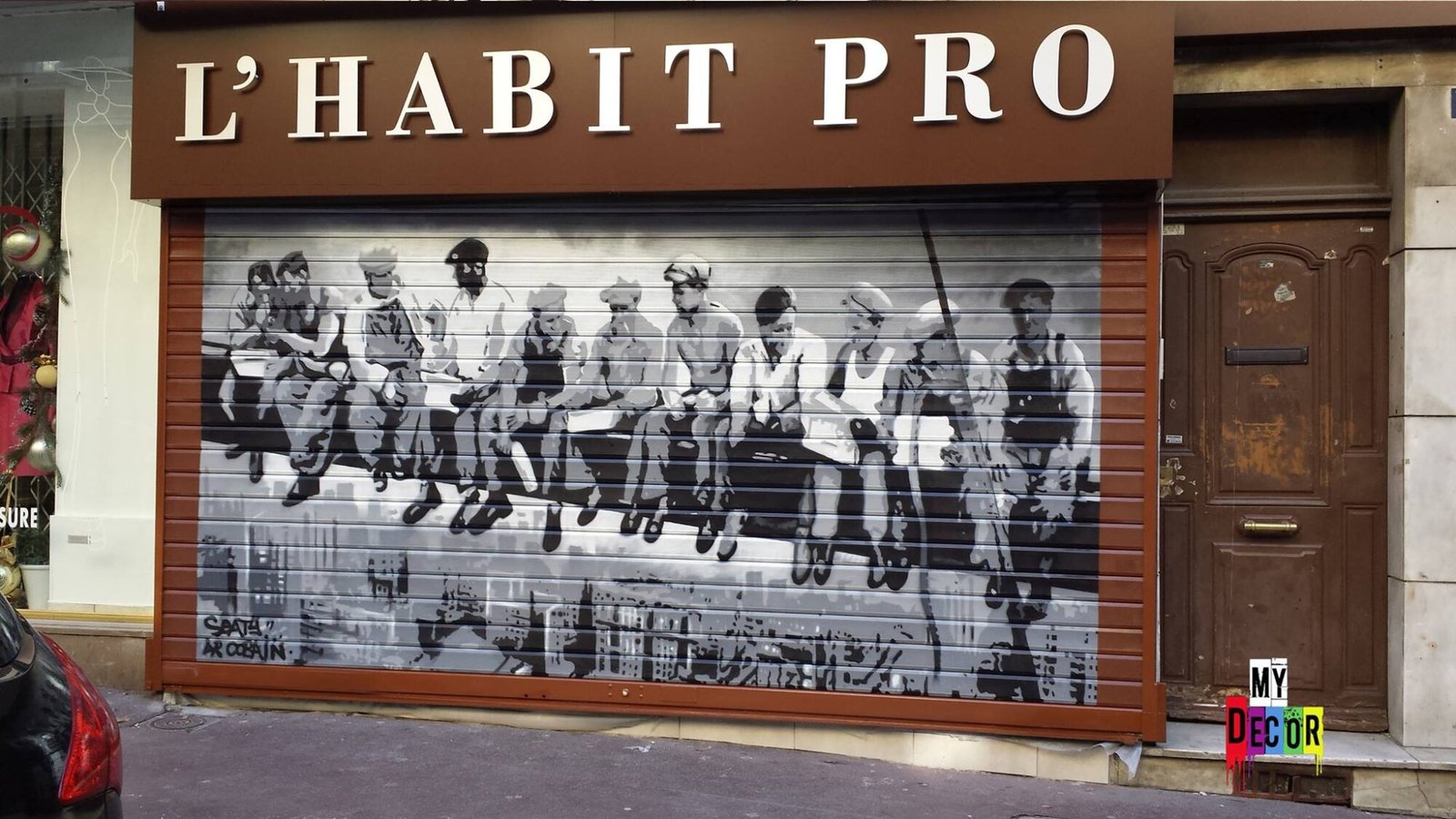 Reproduction de la photo mondialement connu « LUNCH ATOP A SKYCRAPER » réalisée à la bombe sur le rideau de fer d’un magasin de Marseille.